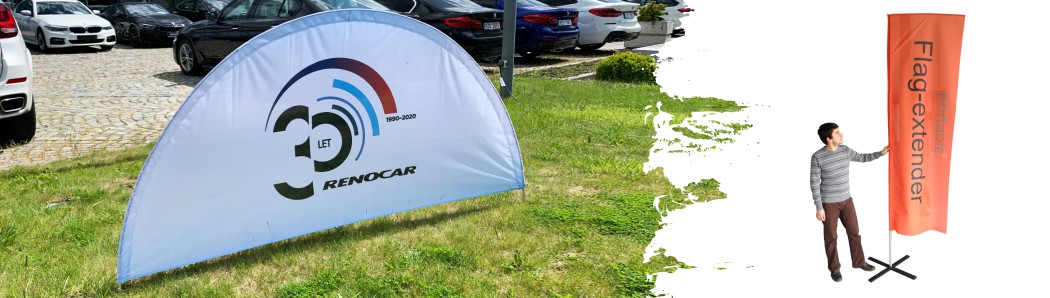 Stožár EXTENDER: originální reklamní vlajka, která dalece přesahuje životnost běžných "čínských" bechflagů a kapek. Kombinovatelná výška a trvale napnutá textilní grafika, jsou hlavními výhodami původem dánského produktu.