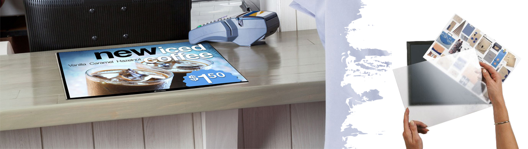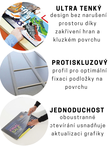 Pultové reklamní podložky s vyměnitelnou papírovou grafikou, ideální pro reklamní sdělení jako je prodejní sleva, cena produktu, nápojový lístek nebo posílení brandu. Odolná podložka je ze spodní časti gumová a protiskluzová. Vrchní část je transparentní a odklápěcí, pro okamžité vložení běžného papíru.