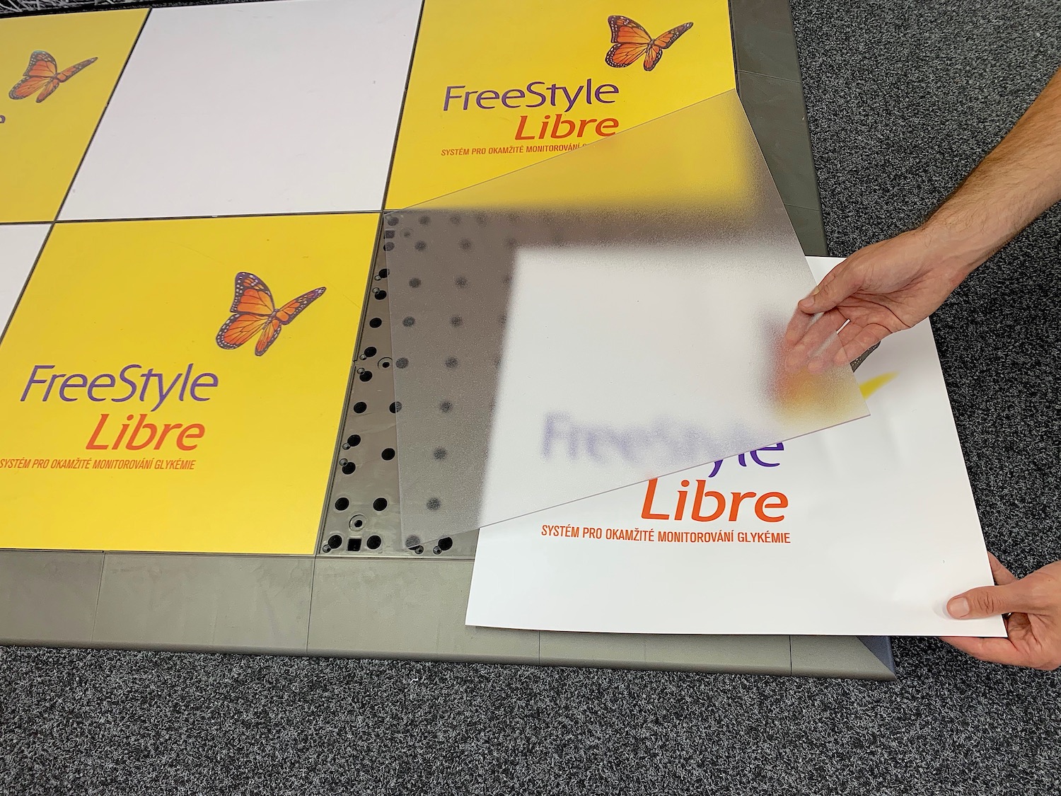 Modulární podlaha se skládá z lehkých plastových segmentů 50x50 cm + vložené grafiky 49,7x49,7 cm, které tvoří nejčastěji potisknutý papír + transparentní krycí panel nebo jiná výplň 49,7x49,7 cm z plastu, dřeva, plechu a nebo hliníku o tloušťce 3 mm. Po stranách jsou použité plastové náběhové lišty.
