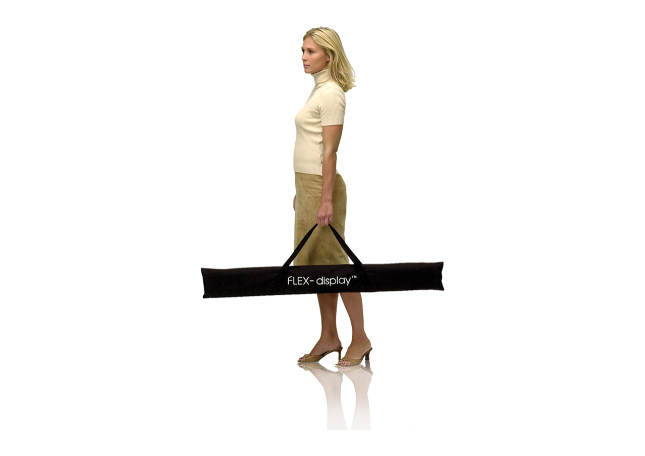 FLEX-display umožňuje nastavit výšku a polohu panelu, tak jak Vám vyhovuje. Poloha panelu může být zaaretovaná hned od spodní časti podstavce - v tomto případě nebudou vidět 2 podpůrné teleskopické tyče. Nebo si panel vysunete dle potřeby až do max. výšky 2,5 m a potom napnete - zaaretujete spodní část.