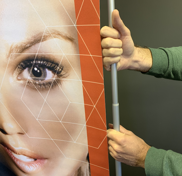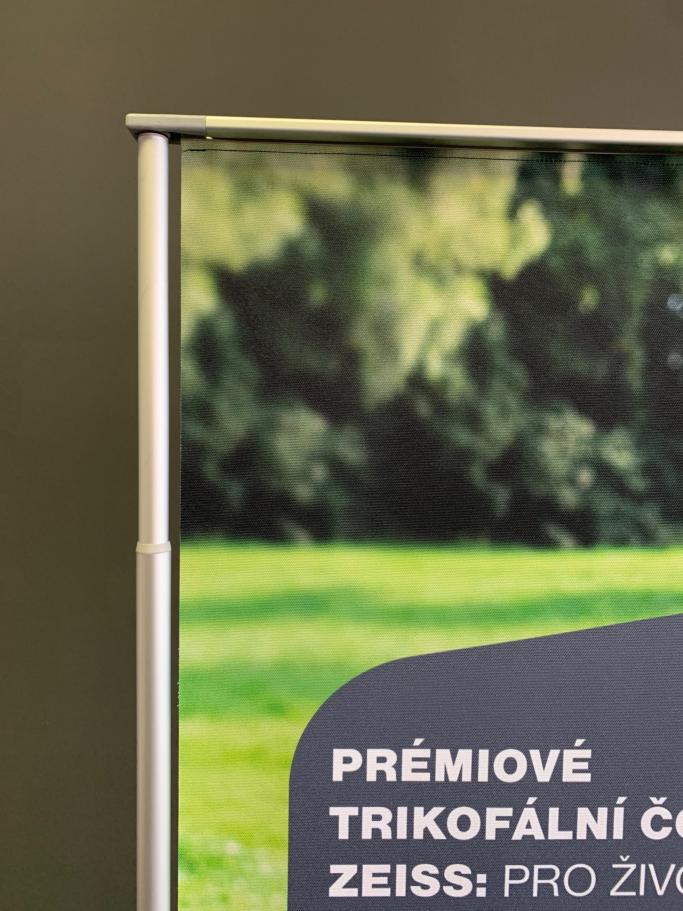 Látkový panel se sublimačním tiskem je lehce vyměnitelný v průběhu několika sekund - stačí jej vysunout z horní lišty a dolního podstavce a nasunout nový panel. Výška je nastavitelná od 140 do 249 cm díky 2 teleskopickým tyčím po stranách textilního panelu. Výšku textilního panelu je možné snížit namotaním panelu na horní lištu. Frame rollup je možno použít taky s oboustrannou grafikou pokud vyměníme jednostanný textil panel za oboustanný bannerový panel.