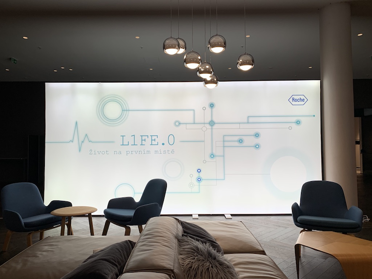 Výstavní modulární systém se v tomto případě skládá z 3 samostojných stěn, které jsou vzájemně propojené do jedné rovné stěny.