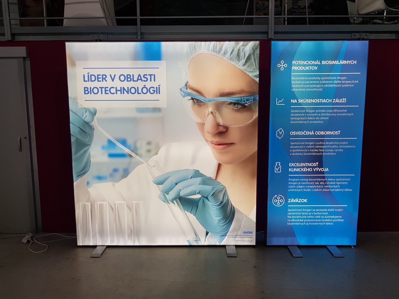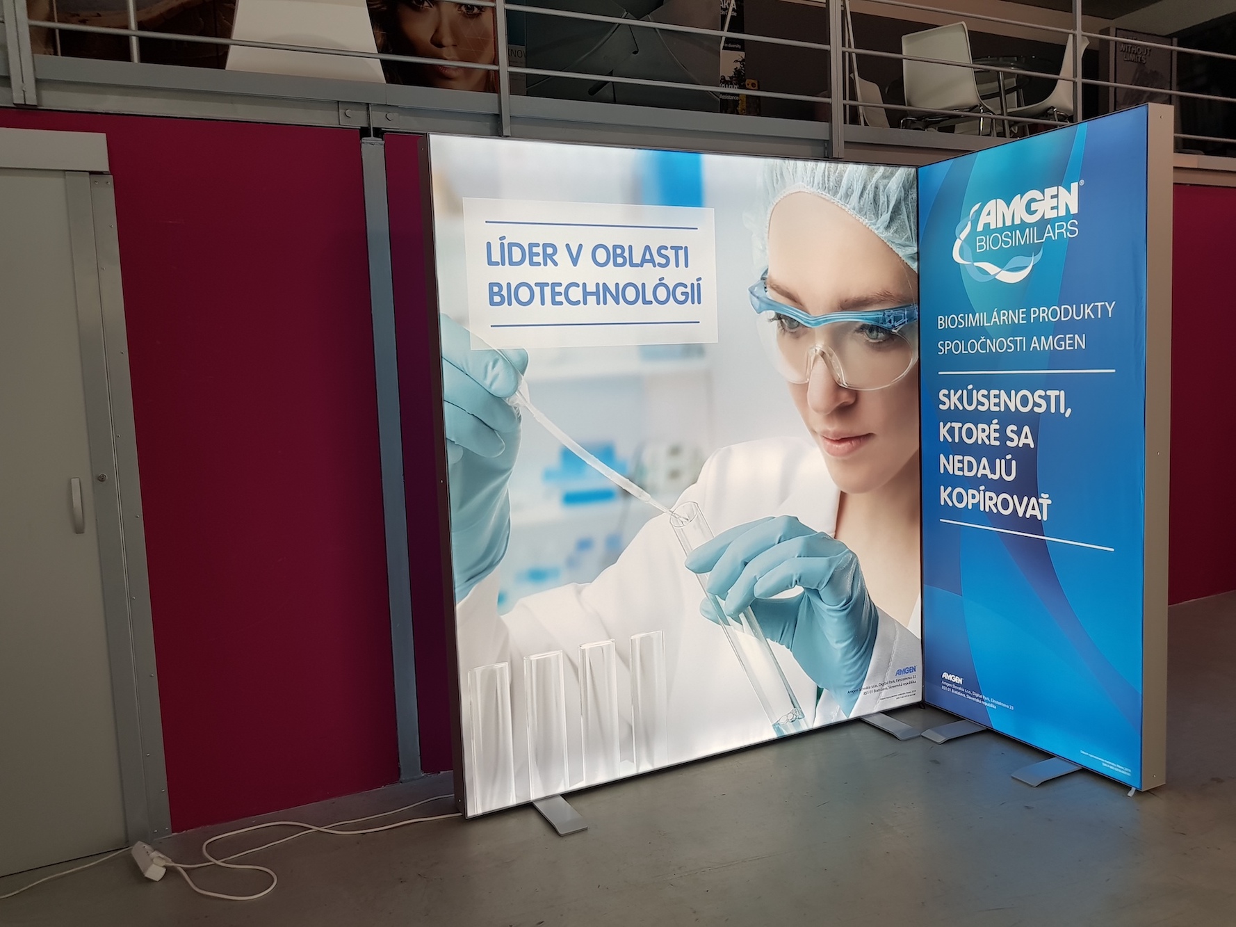 Výstavní modulární systém LUMINOR se v tomto případě skládá z 4 samostojných stěn (3 ks 2x2,2 m a 1 ks 1x2,2m), které jsou vzájemně propojené rohovým sloupem do tvaru L.