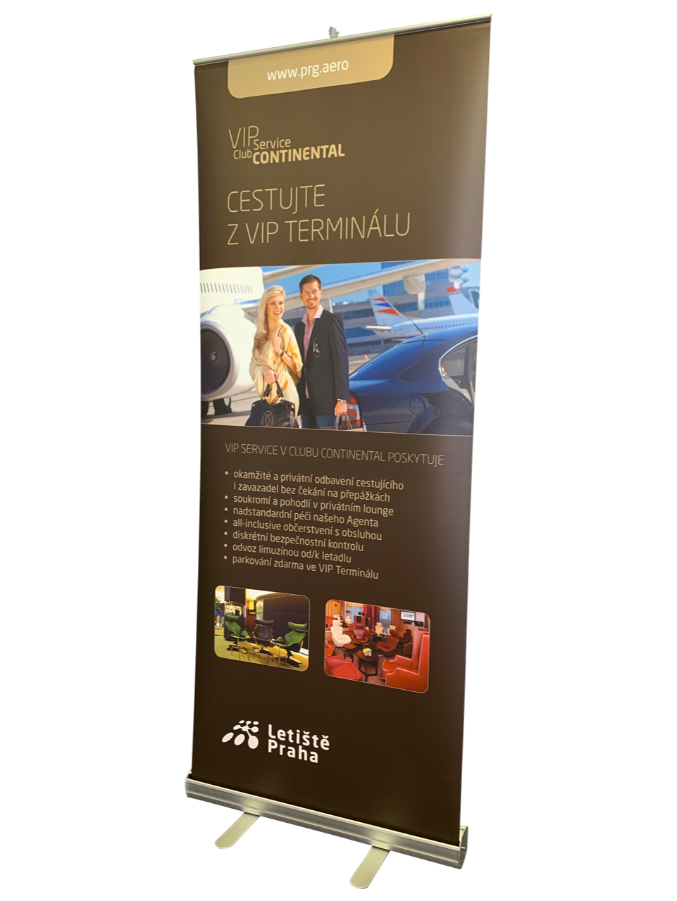 Rollup s navíjecím mechanismem a banerovým panelem. Balený v nylonové tašce. Nejlevnější varianta rollupu.