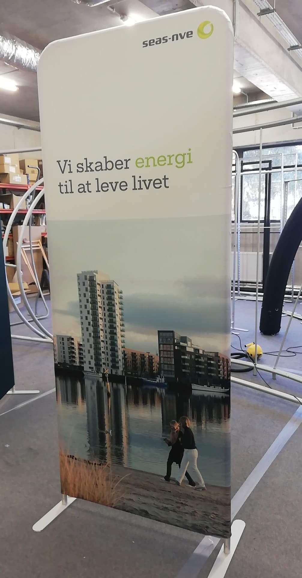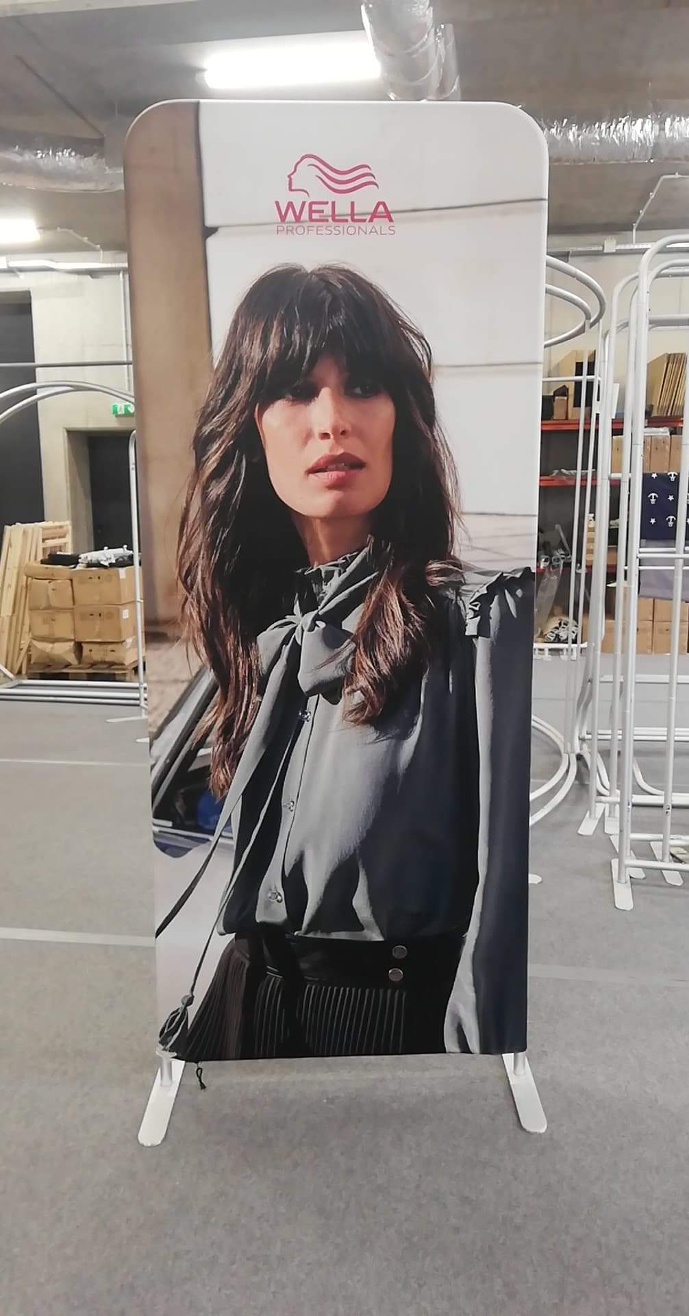 Prezentační stěnu tvoří strečový panel navlečený na trubkovou hliníkovou konstrukci pomocí zipu.