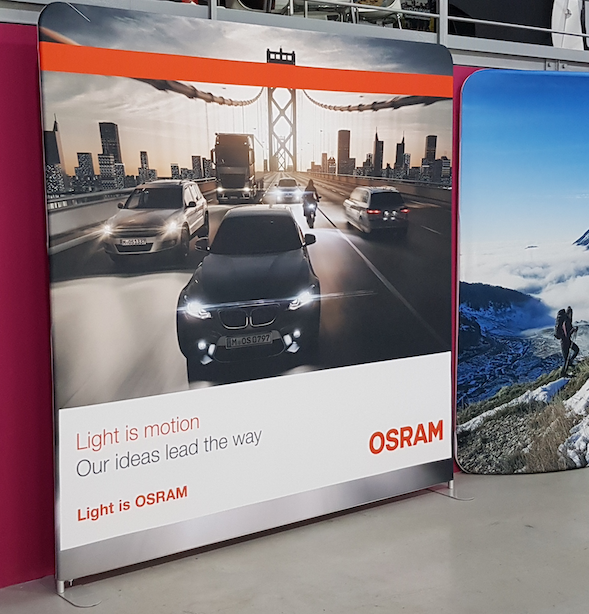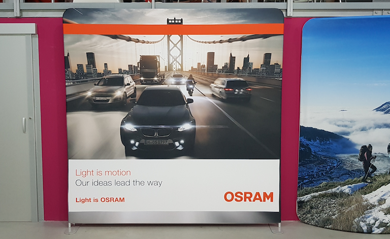 Prezentační stěnu tvoří strečový panel navlečený na trubkovou hliníkovou konstrukci pomocí zipu.