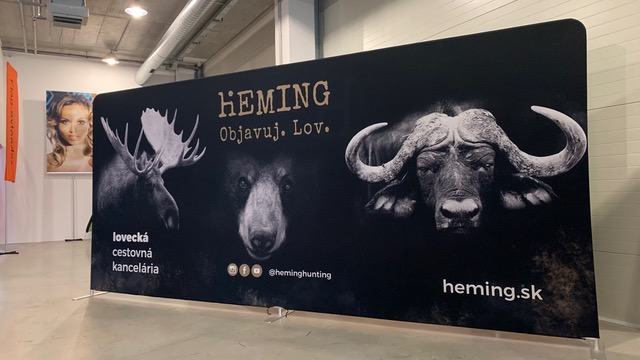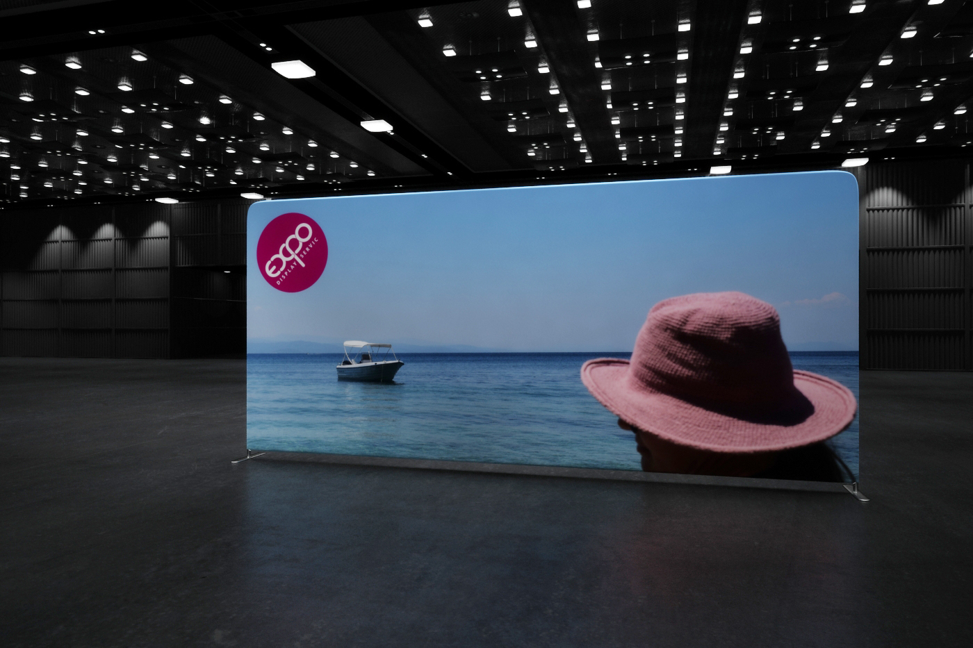 Prezentační stěnu tvoří strečový panel navlečený na trubkovou hliníkovou konstrukci pomocí zipu.