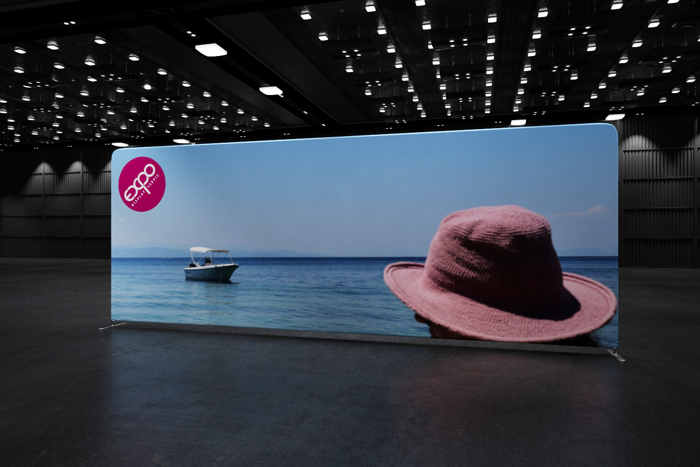 Prezentační stěnu tvoří strečový panel navlečený na trubkovou hliníkovou konstrukci pomocí zipu.