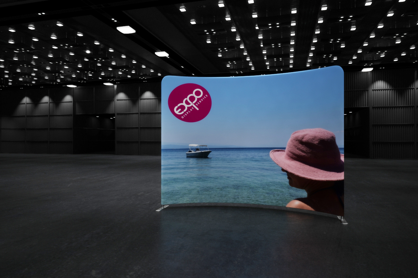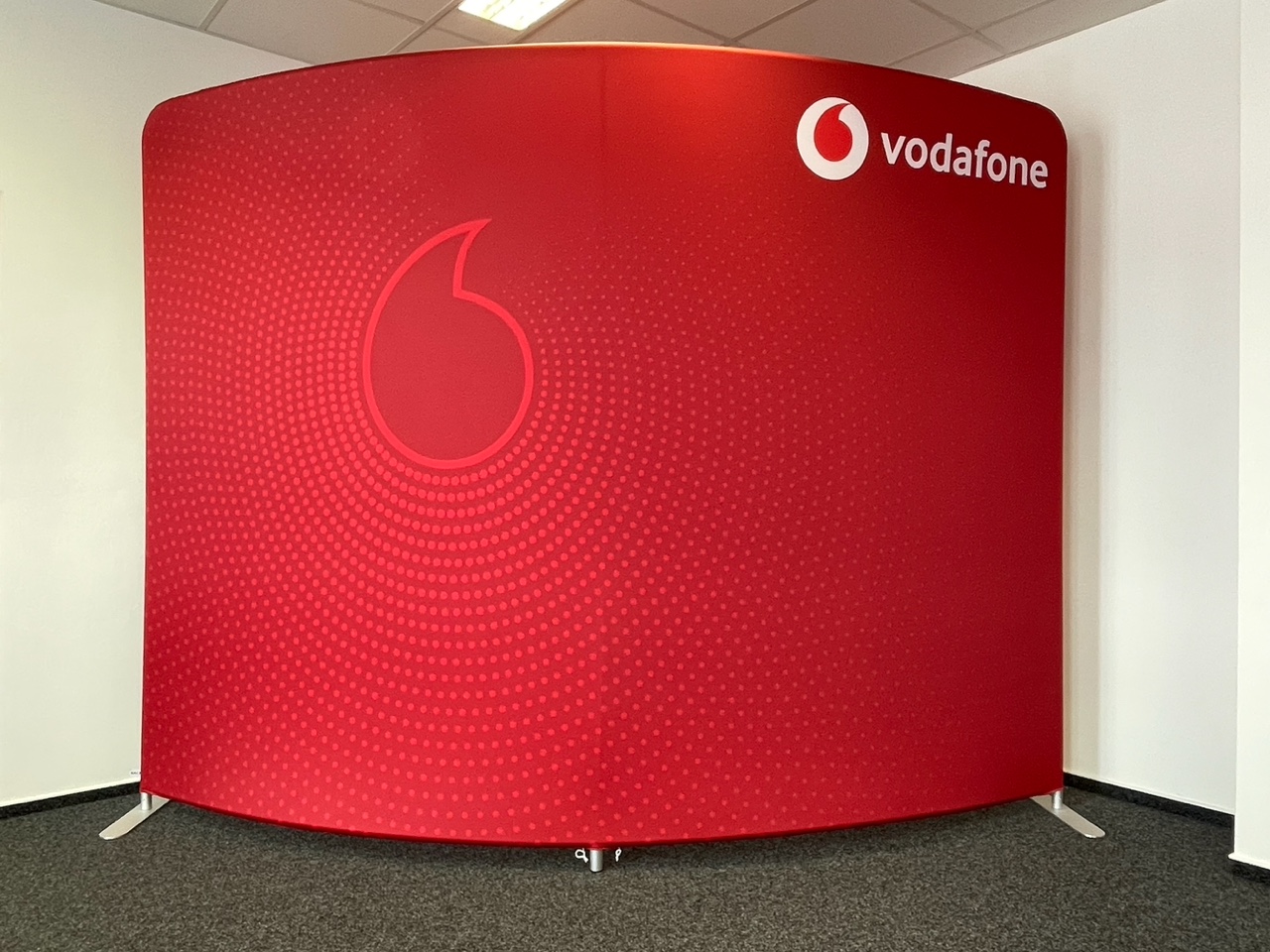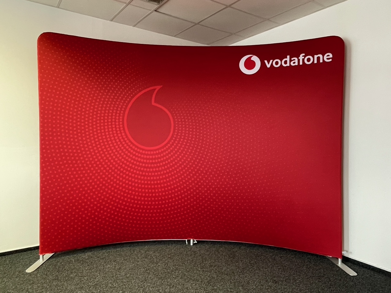 Prezentační stěnu tvoří strečový panel navlečený na trubkovou hliníkovou konstrukci pomocí zipu.
