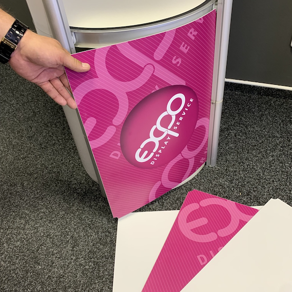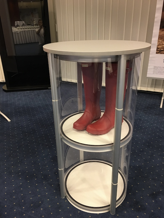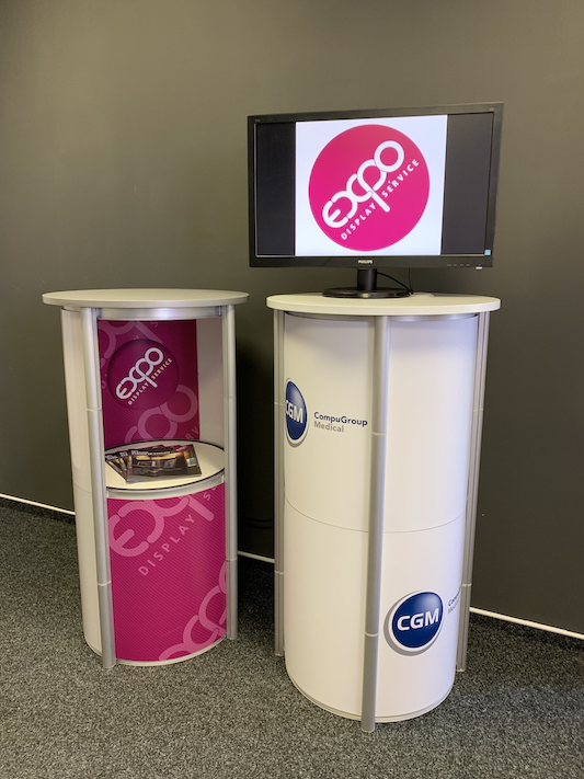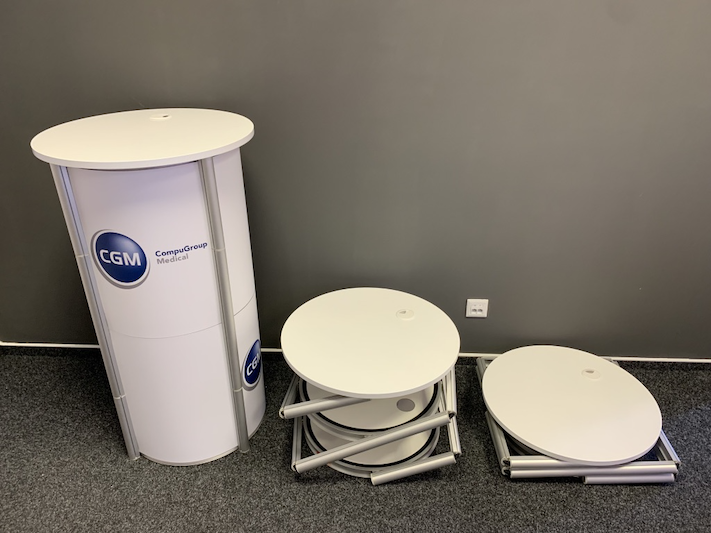 Unikátní rotační hliníková konstrukce, jejíž součástí je i vrchní deska a vnitřní police, umožňuje rozložit stolek během 2 vteřin. Po rozložení stačí už jen vložit do konstrukce PVC panely, což trvá také jen pár vteřin. K dispozici jsou transparentní panely nebo PVC panely s jednostranným/oboustranným potiskem. Při jednostranném potisku je zadní (vnitřní) strana panelu bílá. Stolek je možné použít i jako vitrínu, pokud zůstanou některé panely (nebo všechny) bez potisku. Stolek je možné obalit 8 ks panelů kompletně nebo 6 ks pokud chcete využít vnitřní police. Stolek má dostatečnou nosnost i pro umístnění monitoru nebo kávovaru. Pokud hledáte menší atraktivní prezentační pult, balený v malém pojízdném kufru, tak vřele doporučujeme...
